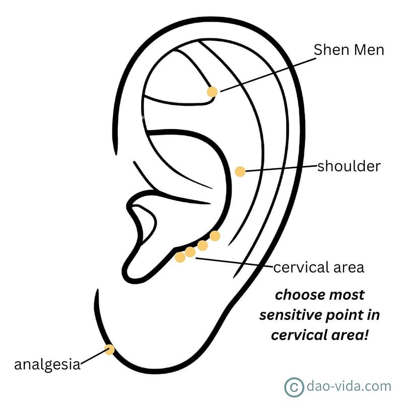 Shoulder & Cervical Area: When there is pain, the corresponding ear points will often be tender on pressure. For best results, first palpate the area of the “shoulder” and “cervical area” (corresponding to the back of the neck) and choose the most sensitive points to apply Dot.On ear beads onto.